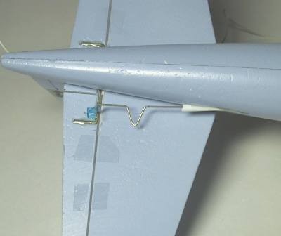 エレベーターリンケージ:途中をVに曲げて長さの調節が出来るようにしてある。ホーンにはL型に曲げて差し込んであるだけ、テンションがかかっていれば抜けません。テープひんじがいい加減。 |