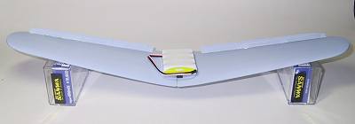 左右の翼をつなぎ1.6mmカーボンロッドを接着。(本当は右下のプラスチックパーツを使うようになっている)翼の表面をロッドで引っかいて埋め込む溝を掘る。プラスチックパーツの部分も1mmバルサを切り出し少し溝を掘って面一になるようにしよう。 |