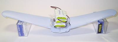 強度テスト:ガラス処理、ベリーパンの取り付けが終わった状態。140gのバッテリー3個でかなり反り返っているが何とか頑張っている、これなら宙返りもロールもイケそうじゃん。 |