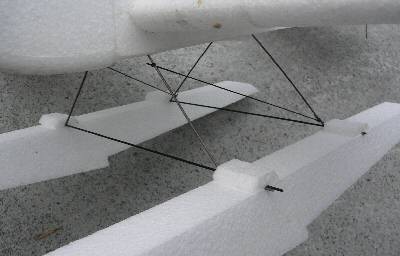 取り付けは フロート上面を床に平行に置く 機体中心線が床に平行になるように尾翼を持ち上げる 機体の重心位置がステップの位置に合う様にして、メインギヤの取り付け位置を決める 後部の支柱はやや長めに作っておいてフロートと機体中心線の平行が上手く出るように多少斜めに取り付けるようになるかもしれません |