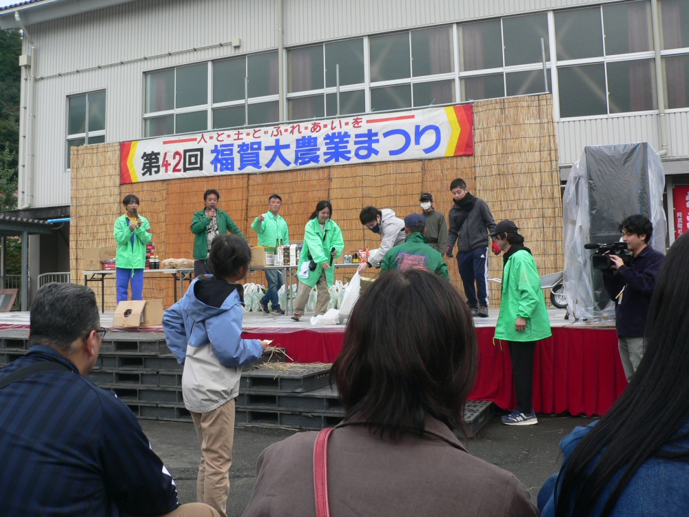 2時頃からは入場時に配られる整理券を使った抽選会です。基本的に一人1枚ですが数枚持った人が結構います。会場には500人ぐらい排他と思いますが抽選券は1000枚ぐらいでしょうか。野菜やお米さらにはマツタケまであり皆さん真剣です。このために来場する人がかなりいるのではと思います。およそ40〜50人に当たります。 |