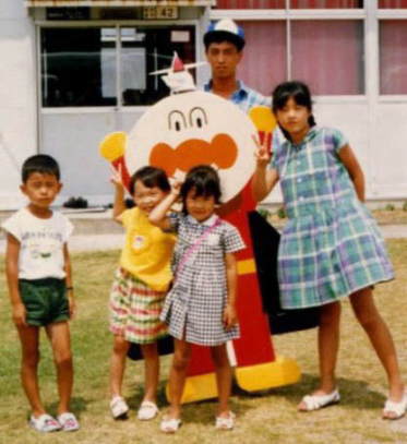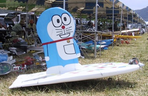 | 1992年に作ったアンパンマンの1号機です。重心を合わせるためにエンジンがタケコプターのようになっています。自衛隊の航空祭でデモフライトをしたときのものです。 | フライイン笠岡に参加した時のもので、左端の橙色のものは広島の人の作品でブタに包丁が刺さったような飛行機です。 |