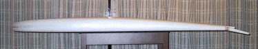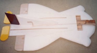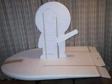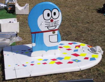 | ドラえもんのサーフボードは発泡スチロールです、翼型にして性能向上につとめています。ドラえもん自身も翼型をしています。 | スチロールに見える茶色い線は補強材の2*10mm檜棒です。ドラえもんの身長は85センチで体重は290g、ボードは幅90センチ長さ168センチ、全体の重さは3,6kg、エンジンはYS91で今回は引き込み脚を装備しました。 | |