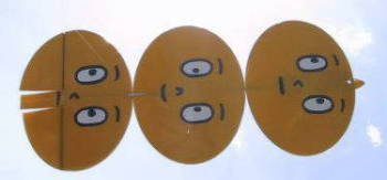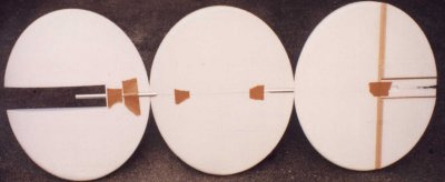 | 一時はやっただんご3兄弟です.直径600mmの発泡スチロールをホームセンターで売っているアルミパイプで串刺しにしました。横安定はいまいちですが10クラスの機体よりはましです。 | 3枚とも翼型をしています、知り合いのNCカッターで切ってもらいました、もちろんパイプの入る穴も開けえてもらいましたがいい精度です。 |