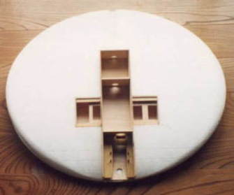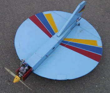 | 15mm厚の発泡スチロールを900mmの円形に切ってメカを載せフイルムを張ったものです。エンジンはOS