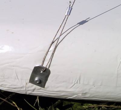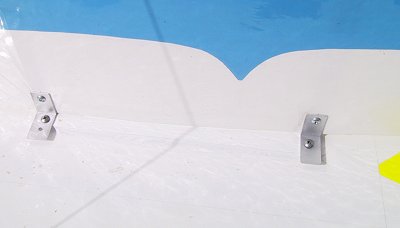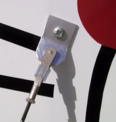 | ボード側の取り付け部分です。1mmのステンレスワイヤーを使っています。スチロールをくりぬき10mm*100mmの丸棒を埋めこみみそれに2mmアルミ板をビス止めです。 | ドラエモン側の取り付けです。ヒノキの補強材のある所にビスを貫通させて2mm厚のアルミ板を止めています。取り外しが出来る様にメタルのアジャスターチップを取り付けています、飛行中に外れたことはまだありません。 | |