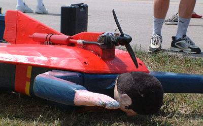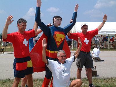 2002夏のF4Cラジコンスケール世界選手権(カナダ)に参加された猿渡さん撮影。 競技の合間のアトラクションに於いて飛行したそうです。 団体優勝のスイスチームとのガッツポーズ、大きさが分かります。 |