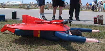 | 飛行性能は文句無く良く飛びます。大きな物が乗っていても宙返りもロールも出来ます、大空でサーフィンをしている様に飛ばすといいですね。 | 2000年のフライイン笠岡に出場した時です。今までで一番受けましたがハンノ・プレトナにはかないません。ギャラリーから歓声が出るのは、落ちた時か、スーパーテクを見た時か、とんでもないもが飛んだときです. | |