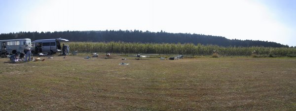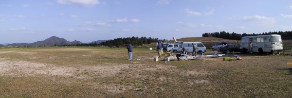 | 滑走路中央から東方向を見る 駐車場とピットです。マイクロバスはクラブハウスです。 |