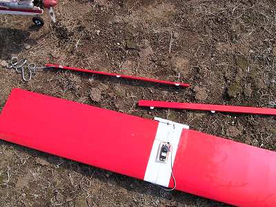 その事故は皆が飛ばし疲れた午後3時ごろ起きた 久しぶりの良い天気に気合いを入れて飛ばし疲れた者が車座になって空中撮影の話題で盛り上がっていた時だった。 バキーと鈍い大きな音がしたのでその方を見ると大きな物体が粉を振りまきながら、ゆるい放物線を描いて地面に落ちていった。 操縦者以外にその瞬間を目撃した者はいなかったようだ。 3分の1と4分の1のカブ同士の空中衝突だった |