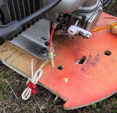 ホビーセイバーさんでCHアンプ式に改造しましたが写真の一番右端がはずれた所です。これにバッテリーをつなぎスパーク用の電源になります。改造の利点はやや軽くなることと手でクランクしても懸けられる事、そしてエンジン上部の出っ張りがなくなりカウルに納まりやすくなります。 |