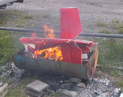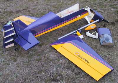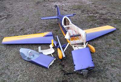 前回エンジンポロリをやった機体が見事復活、華麗なフライトを見せるはずだった、、、、しかし離陸して第一旋回をする前にエンスト、不時着大破となってしまった。(本人かなりショック) |