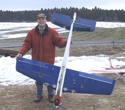 2003年の幕開け残雪が見られる、我が福賀飛行場では、次々に航空機事故が起こったのだ。 その1 去年結婚して今年は家を建てる(飛行機の製作場所が欲しいばかりに無理をしているとのうわさだが、無理が出来るだけでも羨ましい)上村さんの新作セダクション90、これはワンフライトの後の写真です。満面笑みですが良く見るとあちらこちらに傷が、良く言えば胴体着陸をしてしまいました。 本人曰く、レーザーカットの精度が良かったのでギヤーマウントも瞬間で着けただけ、剥がれた跡を見るとリブの側だけは着いていましたが他の三方は全く接着していませんでした。(なんだか自分の工作を見るようだった) |
