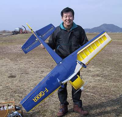 こちらも新作を引っさげての小池さん。タキシング時に足を取られてひっくり返り、二度目にテイクオフ。どうやら一回目にキャノピーに傷が出来ていたようで、すぐにキャノピーが飛んでしまいました。何とかトリムjを合わせ順調に飛んでいましたが今度は何かがひらひらと飛んでいってしまいました、確認すると右翼下面のフイルムが剥げています。しかし結構安定良く飛んで無事着陸。本人の笑顔がものがったています。 YS63を積んだ石井模型の完成機だそうです。なぜだか皆が納得しました。石井模型の飛行機はフィルムがはがれても良く飛びます。 |