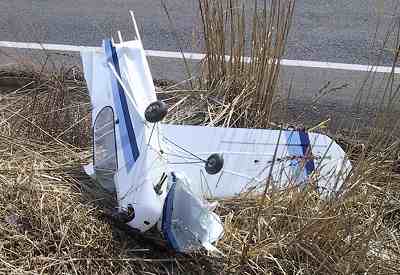 無残な姿になって土手に横たう3分の1カブ、左の翼はもぎ取られてあらぬほうに飛んでいってしまった。 |