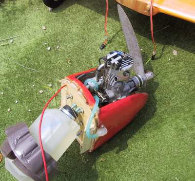 突然のエンストでなんとか滑走路に降ろしたものの脚が飛んで胴体と主翼に穴をあけ、マフラーをこすったために防火壁から取れてしまった。なのに嬉しそうにピースサインをするオーナの田中さん。(彼は全く同じキットの4機目の生地完を持っているのです) |