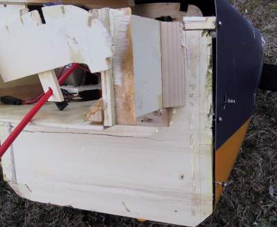 テールスライドで着陸したのでラダーのカウンターバランサーが取れただけで他はほとんど無傷です。重たいエンジンが無ければ機体のダメージは少なくて済む様です。安全委員会からエンジン部分をチャンと直せば飛行しても良いとの許可が出ましたので修理したいと思います。 |