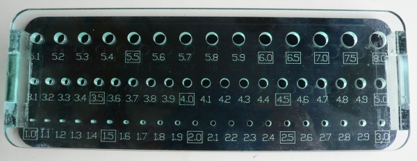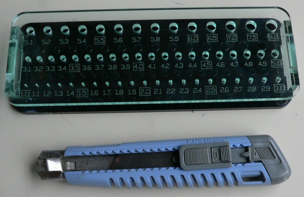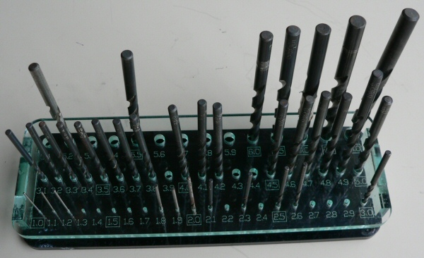 こうして使います。 ARFしか作らない人でもリンケージやエンジン、モーターの取り付けで必ず穴開け作業があります。 私は1〜4mmぐらいのドリル刃をよく使いますが以前はまとめて箱に入れていたのでいちいちサイズをノギスで確認していました、今はすぐ取り出せてとっても快適です。この穴は大変正確で、0.1mmでも小さい穴には入りません。まだ開いてるところが多いですがいつか全部揃えたいですね。 フライトホビーで1260円でした。 |