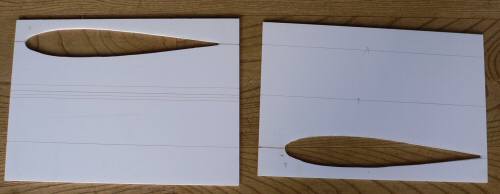翼の取り付け角を出すジグです。5mmスチレンペーパーを翼型に切り抜き中心線に平行に線をいくつか引きます。 |
