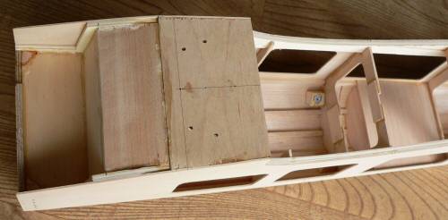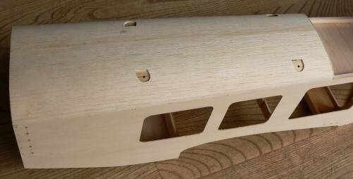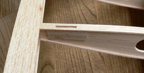 胴体上部、上翼支柱のベースは堅木が3mmベニヤの胴枠に取り付け済みでした。プランク材を切り取り直接支柱が堅木に当たるようにしました。 |
