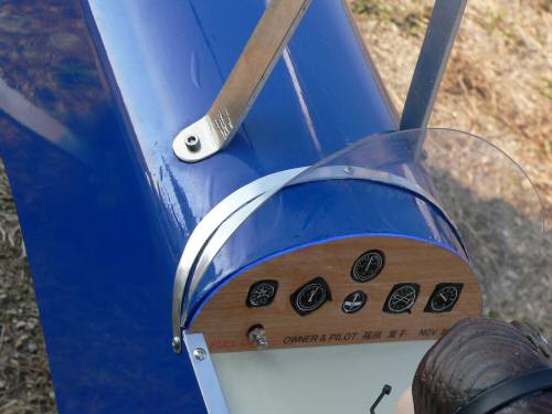 上翼支柱は丈夫なジュラルミンで成形してありました。メーターパネルはネットで壁紙、木目調で検索して気に入った物をホワイトラベルに印刷し保護フイルムを貼ります。1.5mmバルサに貼り付け、IMのメーターセットをバルサを切り抜いて貼り付けてあります。メインスイッチはエンヤプラグの頭です。2mmネジなので使えます。 |