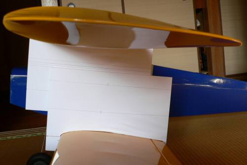 取り付け角は 0−0 です。下翼を先に決めます。上翼の前側のボルトを留めます。上下翼の線が揃うように後ろ側を微調整して決めます。インシデンスメーターを買わずに百均で間に合いました。 |