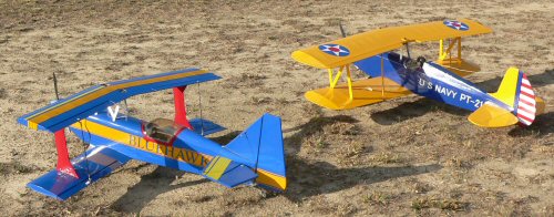 M田さんのカールゴールドバーグのアルチメイトと並べてみました。写真で見ると同じ大きさに見えるように写しましたがPT−21の方が一回り大きいです。アルチメイトはYS140です、かっとびます。やはり両者のフライトイメージは違います。 |