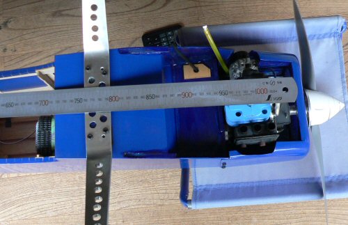 重心位置は程指定の位置にだいたい合いました。重さは5.2kgと予定までは減りませんがこれ以上は無理です。静止推力4.7kgのFG−20の実力はどれほどか楽しみです。カウル下にアンプやコード類が覗いて少し不恰好ですが気にしません。 |