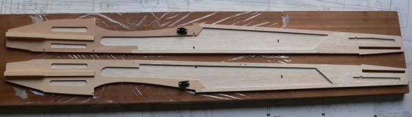 さて一番の腕の見せどこらは側版の上部に付く部材のF16,19の下面を側板に合わせて斜めに削るところです。大体の角度に台付きサンドペーパー傾けて全体を満遍なくすり合わせます。時間をかけて現物合わせでじっくりやればほぼ納得の行く出来になりましす。もし隙間が出来たときは薄くスライスしたバルサを挟み込んだりバルサの粉を盛って瞬間で固めたりしてごまかしましょう。 |