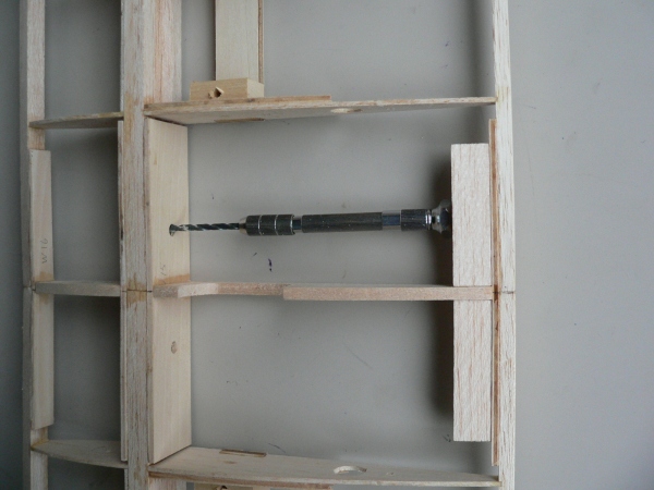 リブを抜き取りますが抜けにくい箇所はカッターで切り取ります。片側分を揃えて虫ピンで止めて全体を軽くサンディングしました。フイルム張りのために前後に錐で空気抜きの穴をあけておきました。エルロンのコードが通る穴を大きめに開けなおしておきました。 |