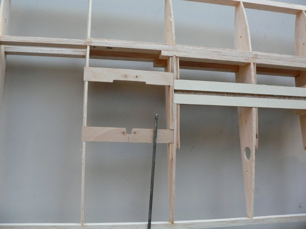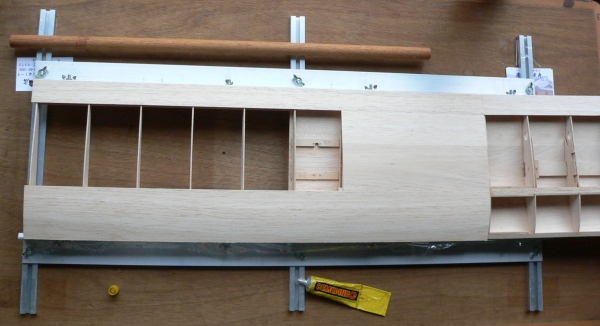 胴体が左右に曲がっていないかを見るには胴枠の底の部分に中心線を書いておき糸を張ったり睨んで見て確認します。今回は見事にまっすぐ出来ました。もし曲がっていたら胴体最後部のF14と側版の位置をずらしたりひねったりするとかなり調整が出来ます。問題なければしっかり瞬間を流して本固定します。 |