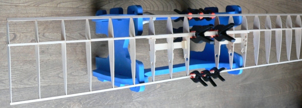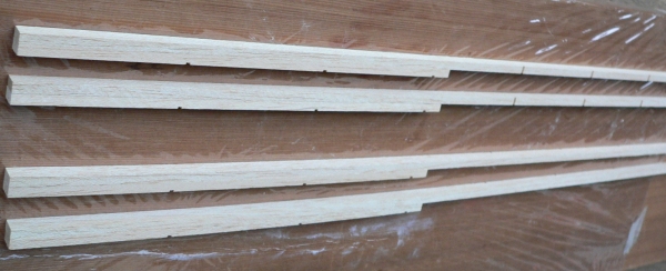 始めにスパー材の接着です。写真で見て下側に短いスパーをつけますが、上の2セットはリブが入る切込みが手前側ですが下の2セットは切込みが裏側になります。 |