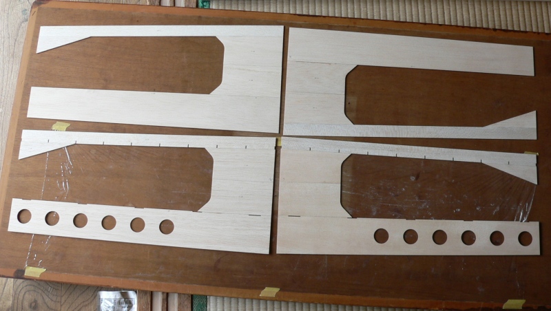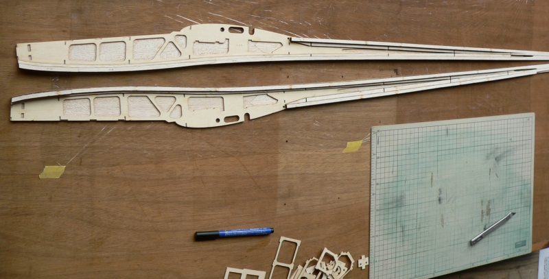 胴体の組み立てでは同じ側を2個作らないのはもちろんですが F−2,3,4は左右で違いますので注意が必要です。内張り補強ベニヤのF−3は前と上のラインをF−1と揃えることでほかの部材も位置が上手く決まります。 |