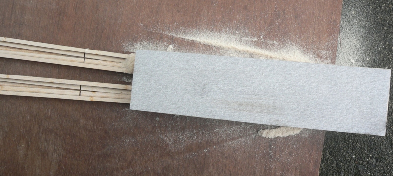 4月17日 主翼は部分プランクですが始めにプランク材を繋いで裏表をサンディングしておきました。 |