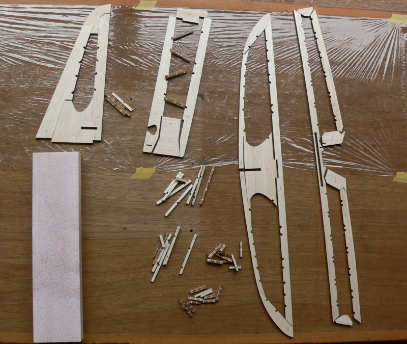 レーザーカットされたバルサの板やベニヤ板などがおよそ30枚。キャノピーや小物パーツも充実しています。 ただね、昔からキットを作ってきた自分としては見た感じでこれが飛行機になるんだというイメージがわかないんです。切り出されたリブや加工された前後縁材など見ただけでこれはあそこの材料だと分かる物が少ないのでイメージをつかみにくいのだと思います。キットを作っている会社も減ってきて時代は変わってきていますね。 |