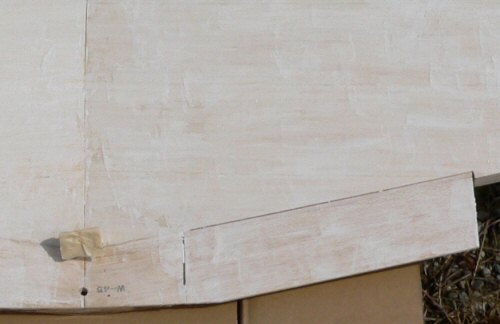 絹張りの下地はフライトホビーの物を使います。仲間内で評判がいいので使ってみることにしました。主翼はフルプランクにしました。重くならないようにフライトホビーでSSグレードの2mmソフトバルサも一緒に買いました。下地用の1セットでフルサイズのスタント機1機が仕上げられるとのことですが、説明書の半分の量で調合しました。それでも2度塗りが出来る程の量でした。乾きは早く主翼の表、胴体の上半分と塗ったら既に主翼の表は乾いているのでひっくり返して裏を塗るというように進められます。どうせ研ぎ落とすんだからとたっぷりと塗ってしまいました。 |