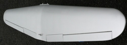 二度目のサフェーサーを吹きつけて、#320〜#600でサンディングした後の主翼です。動翼はペーパーヒンジで仮付けして吹きつけましたが固定されていないのでサンディングは取り外してやりました。軽く研いできたつもりですがリブの間にはサフェーサーが見事に残っています。 |