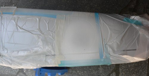 マスキングテープをつないで大面積の物を作りサークルカッターで日の丸の円を切り所定の位置に貼り付けます。白は色つきが悪いので何回も吹くうちについ厚塗りをして垂れてしましました。迷いましたがやり直しです。下地がウレタンなのでシンナーで拭けば綺麗になります。写真はやり直した後のものです。翼の上下と胴体とで6個です、それに尾翼のマークなどでやり直しを含め6本も使ってしまいました。 |