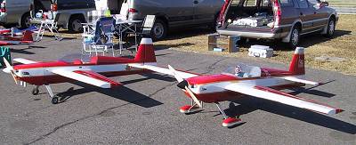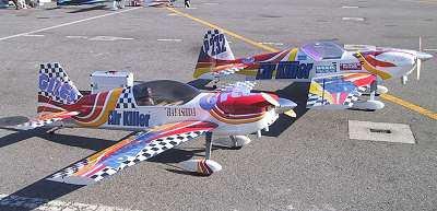 お馴染みのカラーリングの機体が二機。奥が新熊さんの3mキャップ、手前が林田さんのエアキラー製.2.6mのG202、これは近じかバルサキットとして発売されるそうですがもうかなりの注文があるそうです。 |