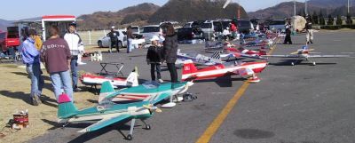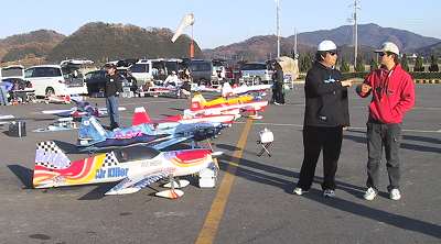林田君と音田君があっち向いてほいをしていた、と思ったらデュエットフライトの打ち合わせのようです。日本でもトップクラスの二人ですから上手かったです。3時頃になるとフライト順を待つ機体が整列してきました。まるでコンクールドエレガンスの審査の様とは、須磨模型の藤本さんの弁 お世話になりました。 |