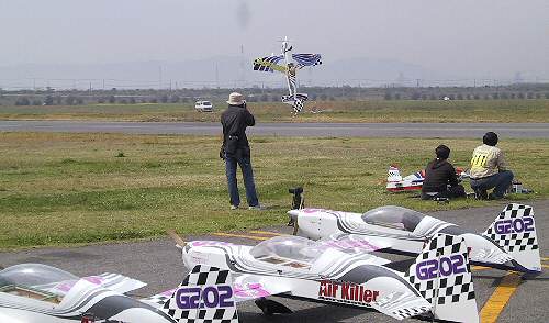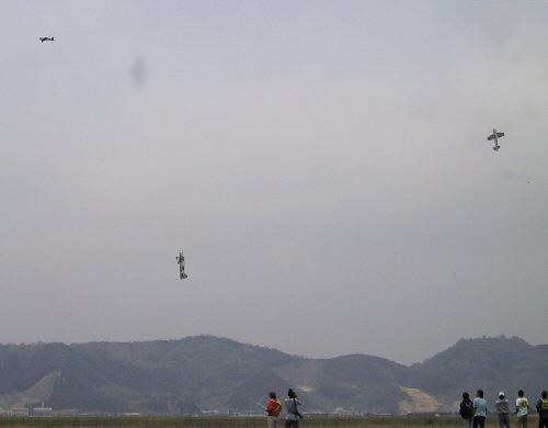 アトラクションとしてエアキラー製G202の6機同時飛行。新熊さんの指示で6機が同時にループ、コブラ、トルクロール、、フラットスピンなんかするのですがコースが近いのでぶつかりそうでハラハラドキドキです、しかし期待どうりにはぶつからず全機無事着陸。 |