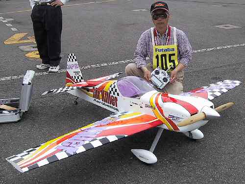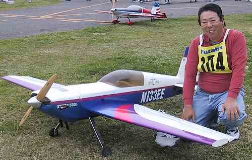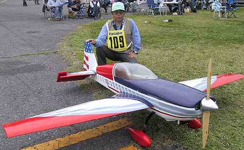特別ゲスト フランク.ノールさん 機体は新熊さんの3.3mキャップ。 手慣らし飛行をしたぐらいだけと思うが慣れない機体で凄いことをやってくれます。流石TOCパイロット。 |