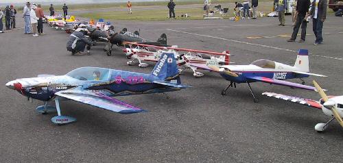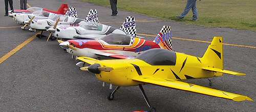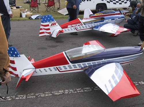 駐機場に並んだエアキラー製 2.6m G202 エンジンはDA100が5機、ZDZ120が1機。カラーリングがいろいろ有って個性を出している。キットならではだ。 |