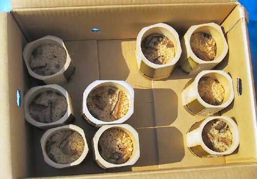 お昼に出たのは かぐや姫弁当 竹のお椀に、炊き込みご飯が入っている ネーミングの上手さが凄いが味は普通だった |