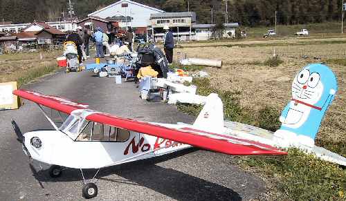 この様な場所に関わらず突貫工事で仕上げた1/4カブの初飛行をするつわものがいた。OS160ジェミニを積んだこの機体は、他のページでネタを提供してくれた Kさんの最新作だ。 後ろではドラえもんがエールを送っている。 |
