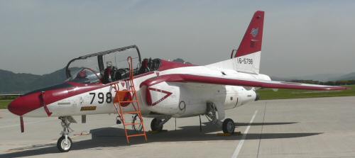 T−4 ブルーインパルスと違い赤い塗装です。そういえば今年の機体は赤系が多いですね。 |