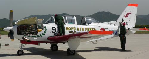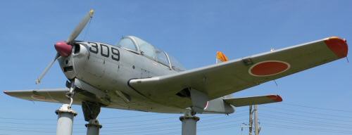 正門を入って道の右側には退役した飛行機が展示してあります。 T−3初等練習機、数年前までこの飛行場で飛んでいた物です。このスケール機を作るなら実物があるので完璧な資料が手に入ります。 |