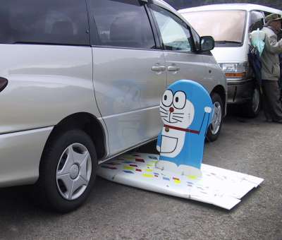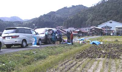 我がドラえもん、雨と風除けに車の側で待機中。寒さと強風で今年はワンフライトのみ、上空ではこんな格好のためかなりふらふらするが何とか操縦は出来たが問題は着陸。地面近くでふらふらするとかなり緊張します、しかし運良く着陸できました。 |