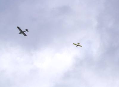 生き残った2機のホバリング 左が1/4パイパーカブ OSFT160、右がカデットセニア OS32.どんな条件でも良く飛ぶ飛行機だ。 |