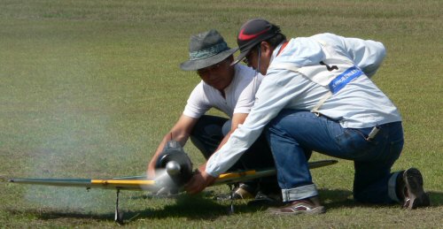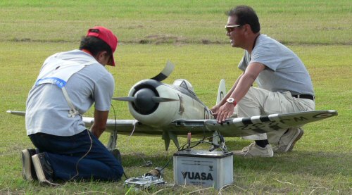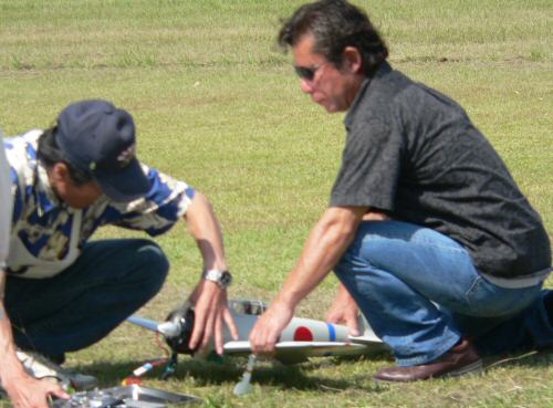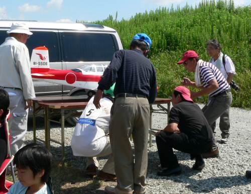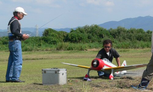 猿渡さんのクラブでは以前の飛行場が閉鎖になって今は大型機が飛ばせ無い状態で、1年ぶりに飛ばすぶっつけ本番だそうです。前日遅くまでエンジン調製をしたそうですが上手く回らないようです。2フライト目は離陸後にエンストして壊れてしまいました。残念です。 |